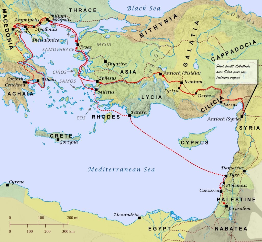 • Paul traverse la Macédoine (Philippes, Thessalonique, Bérée) et arrive en Grèce, probablement à Corinthe.